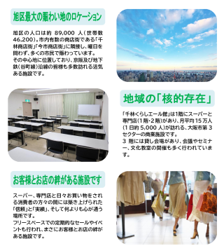 千林くらしエール館は、大阪市内でも有数の商店街を持つ大阪市旭区千林・今市地区の一層の活性化を図るため、国の「まちづくり会社」制度(中小小売商業振興法・商店街整備等支援事業)を活用して、国・大阪市等が出資した大阪市商業振興企画株式会社が、高度化資金の貸付を受けて旧小売市場跡地に建設した、コミュニティ施設を併設したショッピングセンターです。
